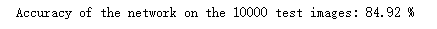 correct = 0 total = 0 for data in testloader: images, labels = data images, labels = images.to(device), labels.to(device) outputs = net(images) _, predicted = torch.max(outputs.data, 1) total += labels.size(0) correct += (predicted == labels).sum().item() print('Accuracy of the network on the 10000 test images: %.2f %%' % ( 100 * correct / total))