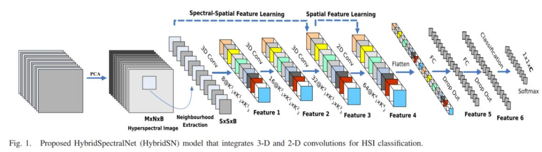 此篇论文相较于上两篇较简单,主要是构建了一个混合网络解决高光谱图像分类问题,首先用 3D卷积,然后使用 2D卷积来实现。