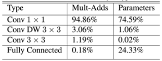 convolution和pointwise convolution,整个网络有28层(这里Avg Pool和Softmax不计算在内)。我们还可以分析整个网络的参数和计算量分布,如表2所示。可以看到整个计算量基本集中在1x1卷积上,如果你熟悉卷积底层实现的话,你应该知道卷积一般通过一种im2col方式实现,其需要内存重组,但是当卷积核为1x1时,其实就不需要这种操作了,底层可以有更快的实现。对于参数也主要集中在1x1卷积,除此之外还有就是全连接层占了一部分参数。