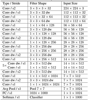 MobileNet的网络结构如表1所示。首先是一个3x3的标准卷积,然后后面就是堆积depthwise separable convolution,并且可以看到其中的部分depthwise convolution会通过strides=2进行down sampling。然后采用average pooling将feature变成1x1,根据预测类别大小加上全连接层,最后是一个softmax层。如果单独计算depthwise