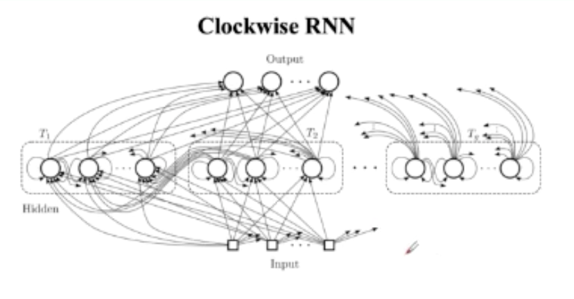 Clockwise RNN:普通RNN都是隐层从前一个时间步连接到当前时间步。而CW-RNN把隐层分成很多组,每组有不同的循环周期,有的周期是1 (和普通RNN一样),有的周期更长(例如从前两个时间步连接到当前时间步,不同周期的cell之间也有一些连接。这样一来,距离较远的某个依赖关系就可以通过周期较长的cell少数几次循环访问到,从而网络层数不太深,更容易学到。