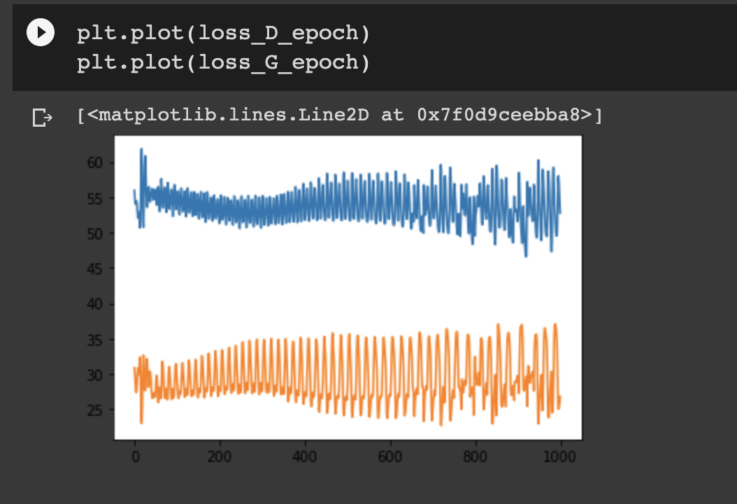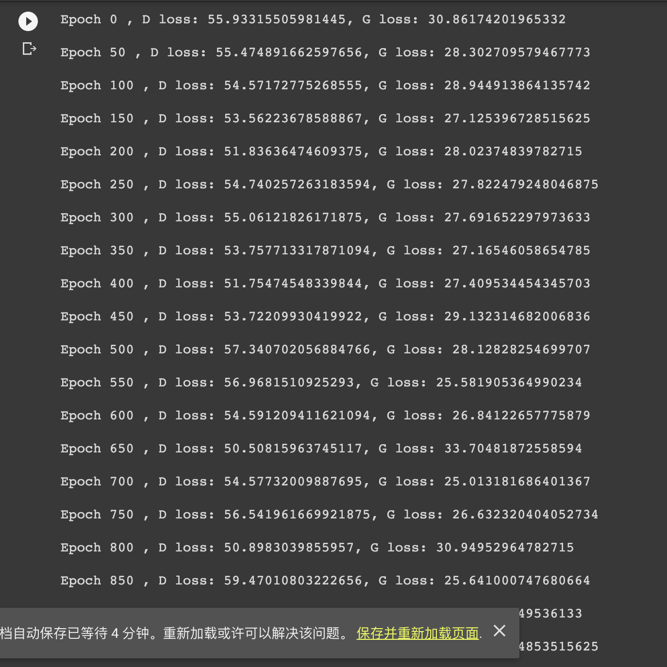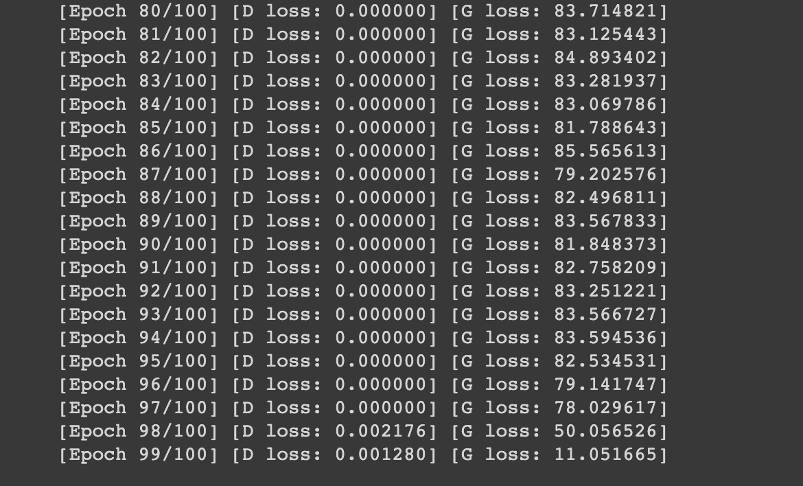 print("[Epoch %d/%d] [D loss: %f] [G loss: %f]" % (epoch, total_epochs, d_loss.item(), g_loss.item()))
