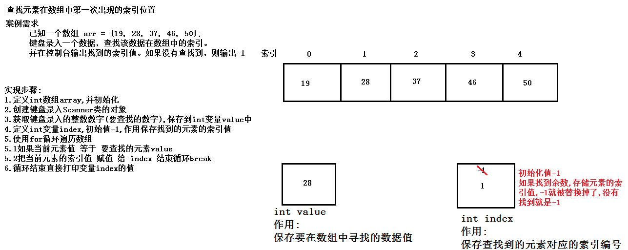 - 4.定义int变量index,初始值-1,作用保存找到的元素的索引值