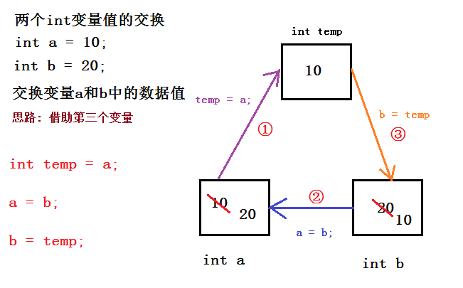 public class SwapVar { public static void main(String[] args) { int a = 10; int b = 20; System.out.println("a="+a); System.out.println("b="+b); //把变量a的值,(赋值)复制一份保存到int变量temp中 int temp = a; //把变量b的值,(赋值)复制一份保存到int变量a中 a = b; //把变量temp的值,(赋值)复制给变量b b = temp; System.out.println("a="+a); System.out.println("b="+b); } }
