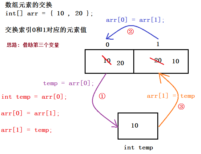 public class SwapArray { public static void main(String[] args) { int[] arr = {10,20}; System.out.println("arr[0]="+arr[0]); System.out.println("arr[1]="+arr[1]); //把数组arr中索引0的元素值,赋值给int变量temp int temp = arr[0]; //把数组arr中索引1的元素值,赋值给数组arr中索引为0的元素 arr[0] = arr[1]; //把temp中的值,赋值给数组arr中索引为1的元素 arr[1] = temp; System.out.println("arr[0]="+arr[0]); System.out.println("arr[1]="+arr[1]); } //定义一个方法,实现一个int数组中,两个位置的元素进行交换 public static void swap(int[] arr, int index1, int index2) { int temp = arr[index1]; arr[index1] = arr[index2]; arr[index2] = temp; } }
