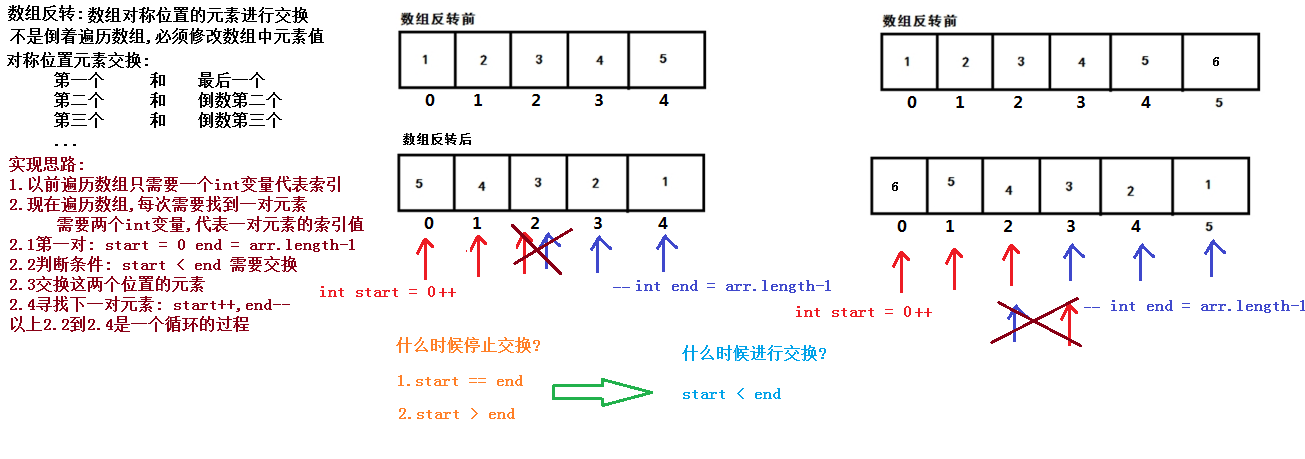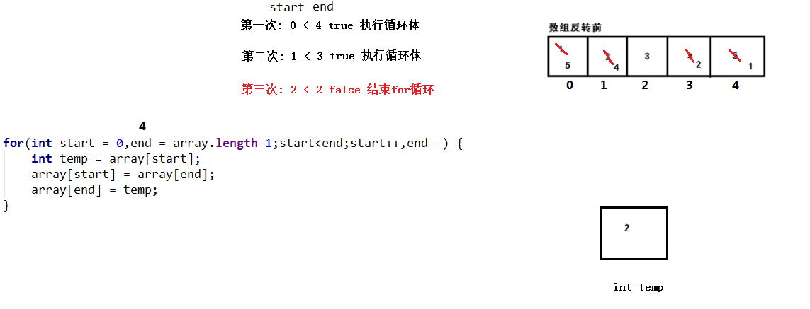 - 初始化表达式: 找到第一对元素的索引值,定义2个int变量start和end,初始值分别为0和数组长度-1