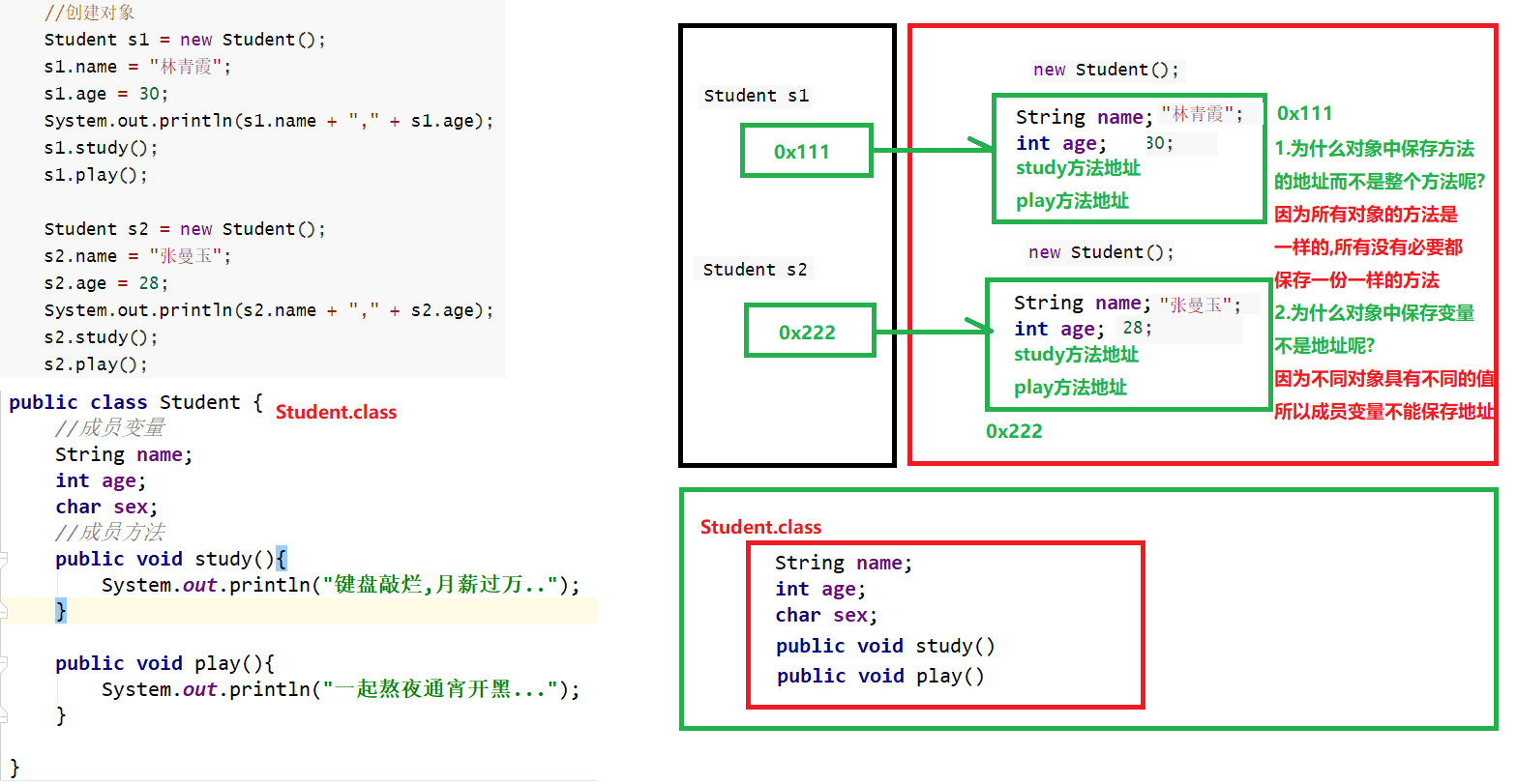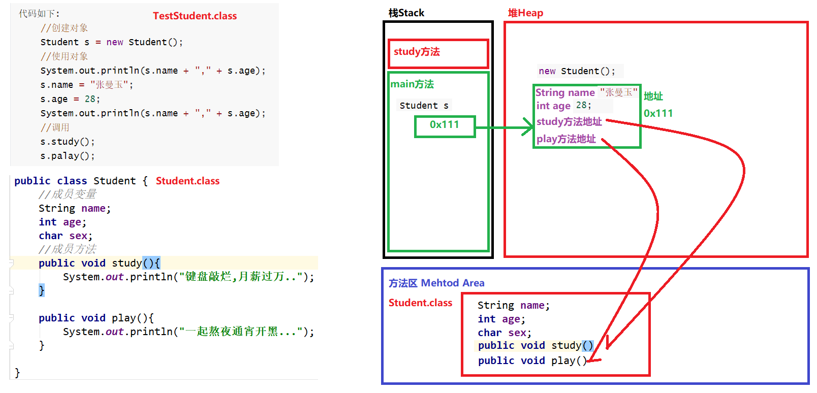 //创建对象 Student s = new Student(); //使用对象 System.out.println(s.name + "," + s.age); s.name = "张曼玉"; s.age = 28; System.out.println(s.name + "," + s.age); //调用 s.study(); s.play();