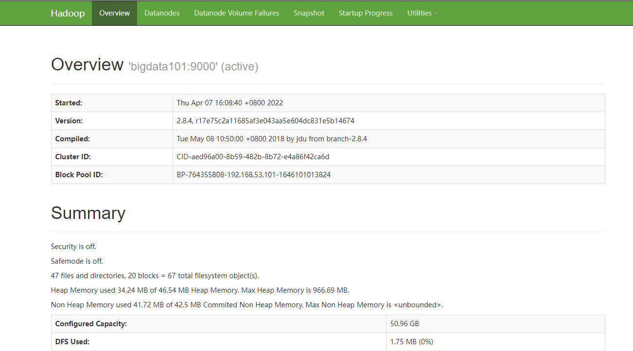 10,打开浏览器,输入地址:http://192.168.53.101:50070/,可以看到如下界面: