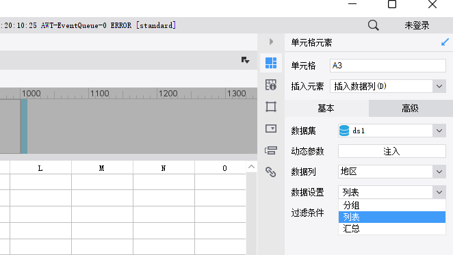 我们在模板里面选中A3单元格,然后选中右上角的单元格元素,可以看见该列列名为地区,选中数据设置,选择列表。