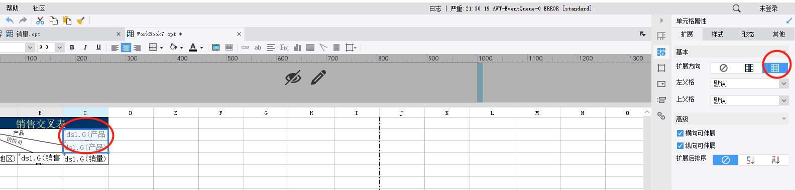 选中产品类型和产品两个单元格,右边选择单元格属性,扩展方向选择横向。