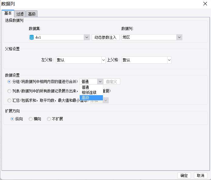现在我们回到交叉报表,双击地区单元格,数据设置分组选中高级