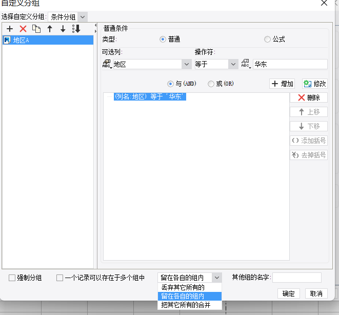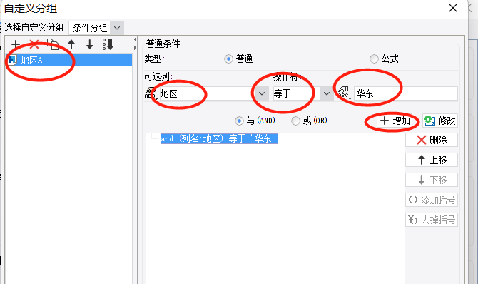 做一下设置:双击条件名称可以修改条件名称,改成地区A,然后选择地区,等于,输入华东,点击增加,此时地区是华东的时候,就会显示地区A