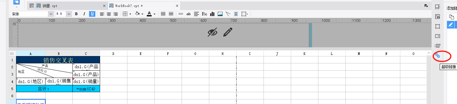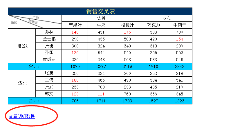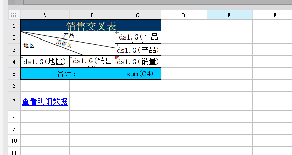 还是在交叉报表中,我们在合计下面选中一个单元格,输入“查看明细报表”,如图;