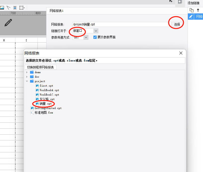 弹窗中点击选择,选中我们之前做好的明细表,在链接打开于选择新窗口: