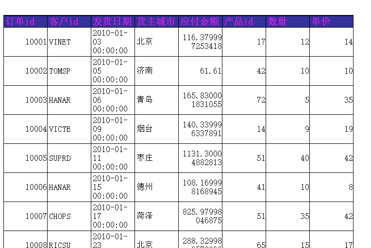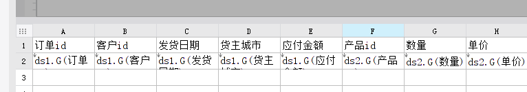 从数据集中拖入我们要展示的字段,其中前五个字段是从订单表中获取的, 后三个字段是从订单明细表中获取的。