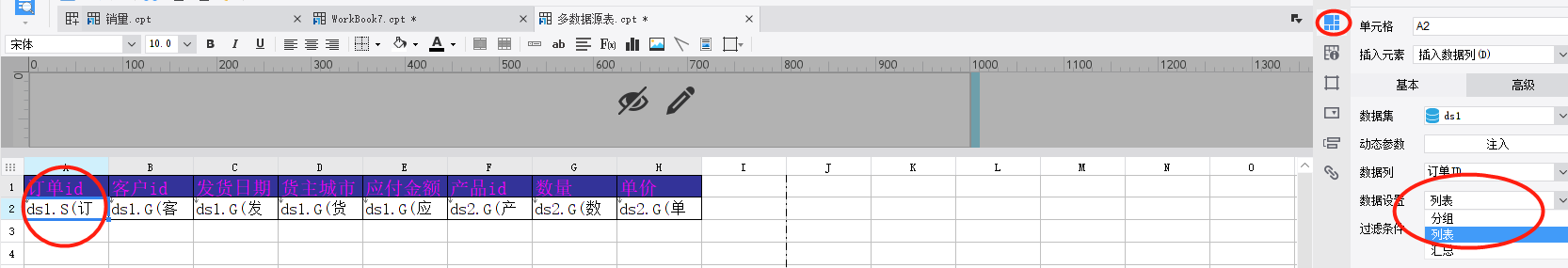 我们先选中订单id的数据单元格,右边单元格元素里面数据设置选择列表,在这里给报表设置成明细表: