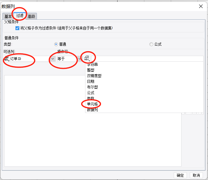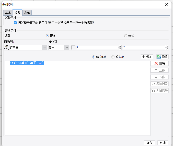 下一步进行两个数据表的关联。首先把鼠标放在第二张表的开始字段,也就是产品id字段上面。然后双击,在弹窗中做如下设置:选中过滤,可选列中选择订单id,这是我们的关联字段,操作符选择等于,选择单元格