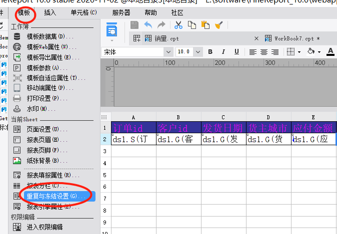 数据已经关联上了。但是这里还有一个问题,就是这里数据太多,如果我们一直往下拉查看数据,标题行就看不见了。如果我们想冻结标题栏,那么应该在这里设置,选中当前模板,在模板中选择重复与冻结设置