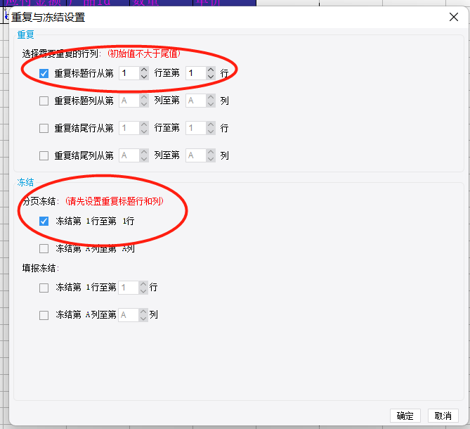 因为我们的标题只有一行,所以选中重复标题行从第一行至第一行,分页冻结第一行至第一行。确定。此时标题冻结就好了。