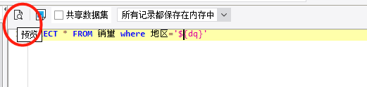 选择select*,这里添加上sql语句以后要设置一个参数:SELECT * FROM 销量 where 地区='${dq}',点击预览:
