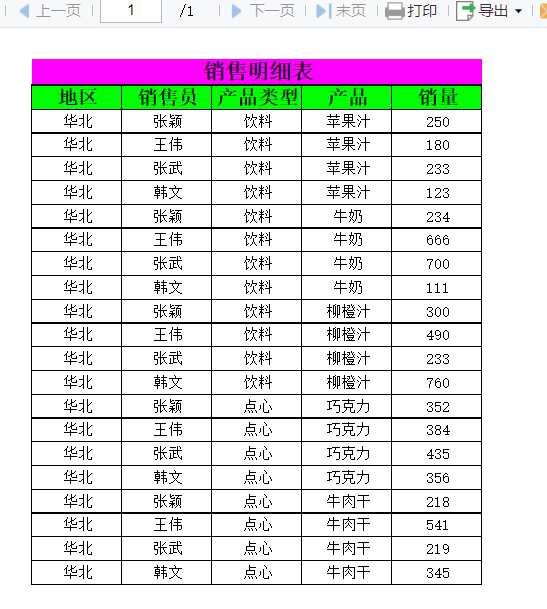 这个时候可以设置报表的基本格式了,添加标题行,给标题行添加背景颜色,设置字体字号加粗,其他单元格设置字体字号,添加边框。然后给这张报表添加一个标题:销售明细表。这里要注意一下,我们这里要做一个明细表,所以地区这个单元格我们要设置一下: