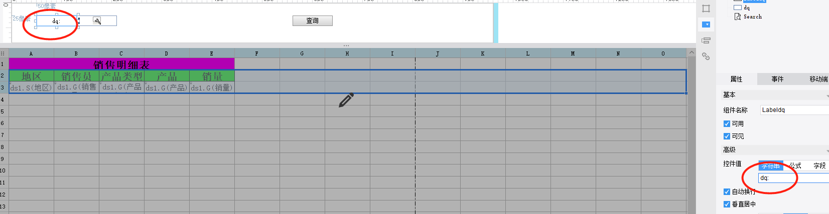 全部添加以后,点击dq控件,右边的控件值,字符串输入控件值”地区“:
