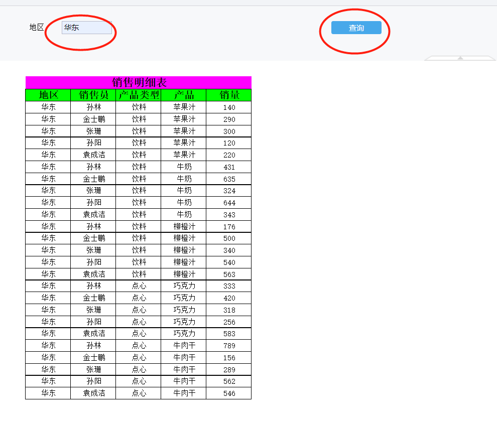 这个时候我们在文本控件里面输入”华东“,就可以展示华东地区的数据。