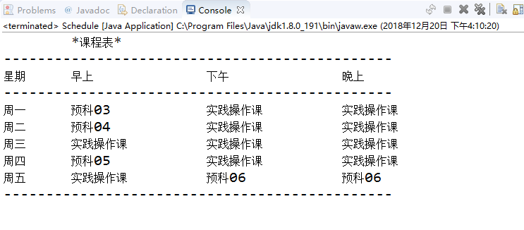 System.out.println("周一\t预科03\t\t实践操作课\t\t实践操作课");
