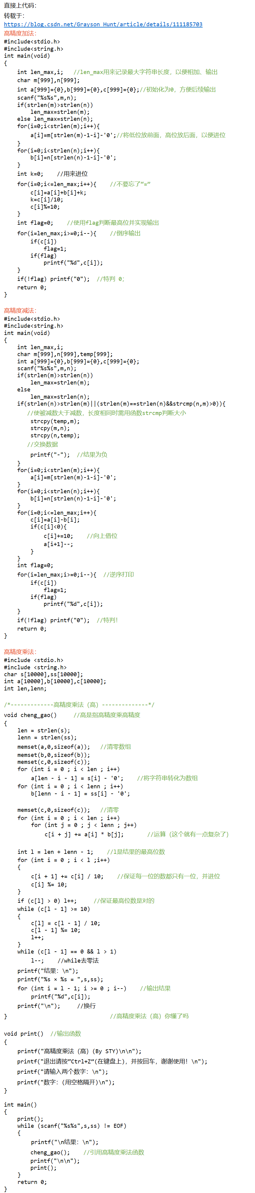 含高精度加法、高精度减法、高精度乘法。一起学习!