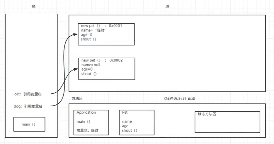 使用new关键字创建的时候,除了分配内存空间之外,还会给创建好的对象 进行默认的初始化 以及对类中构造器的调用。