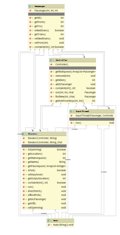 首先Elevator需要增加capasity成员以及isFull()方法,只有未满时才可以加入Passenger;其次,在Main里面构造一个电梯线程类的数组,循环产生制定数目和ID的电梯线程。此外,还需要增加楼层,以及特殊处理负层的输入输出(没有0楼),下面附上类图: