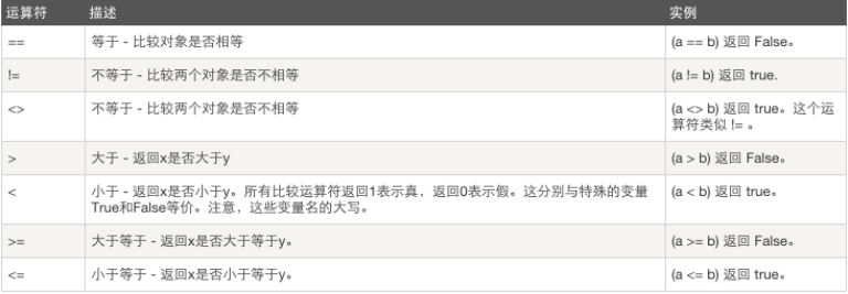 >>> a = 3 >>> b = 5 >>> a == b False >>> a != b True