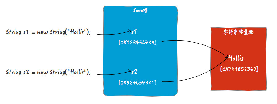 你可以简单的理解为String s1 = "Hollis";和String s3 = new String("Hollis").intern();做的事情是一样的(但实际有些区别,这里暂不展开)。都是定义一个字符串对象,然后将其字符串字面量保存在常量池中,并把这个字面量的引用返回给定义好的对象引用。如下图: