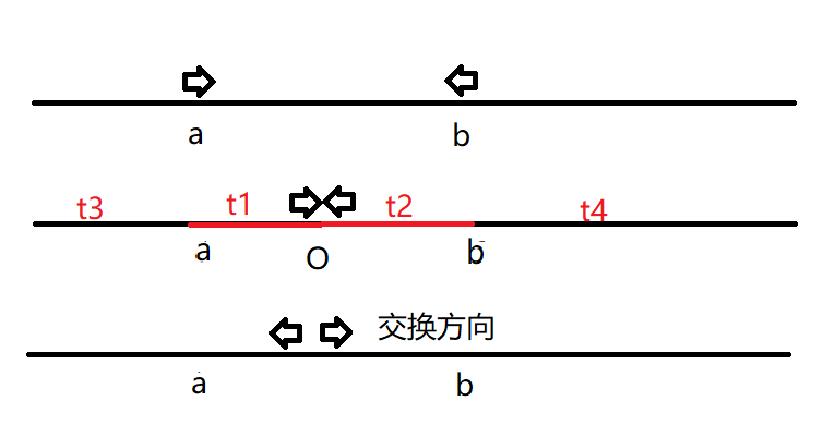 重点分析面对面的情况,假设蚂蚁a走到相遇点使用了\(t_1\), 蚂蚁b使用了\(t_2\),此时它们交换方向,蚂蚁a一共走了\(2*t_1+t_3\)到达出口,蚂蚁b走\(2*t_2+t_4\)到达出口。我们可以想象一下,如果它们不交换方向而是穿透继续走的话,蚂蚁a走了\(t_1+t_2+t_4\)到达出口,蚂蚁b走\(t_1+t_2+t_3\)到达出口,无论是否交换方向,它们总花费的时间是一样的,而且\(t_1=t_2\),因此,每只蚂蚁的时间不受交换方向的影响,是独立的。