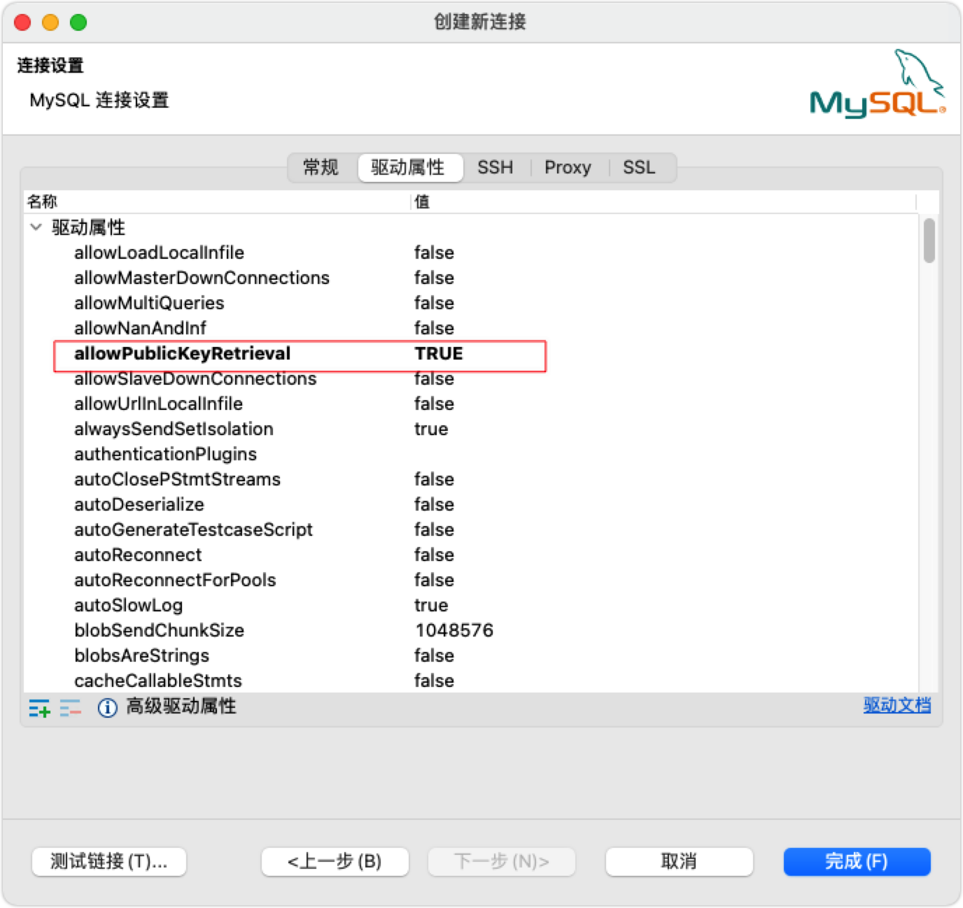 这时,只需要在Dbeaver中,连接设置->驱动属性中的allowPublicKeyRetrieval设置成true: