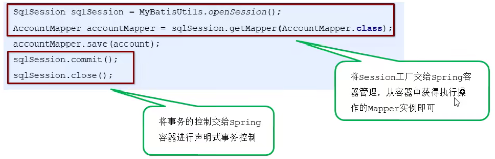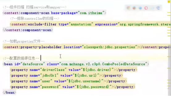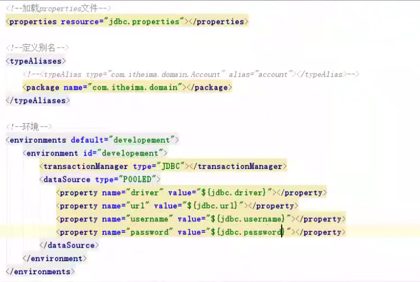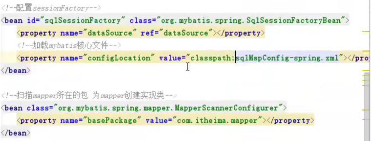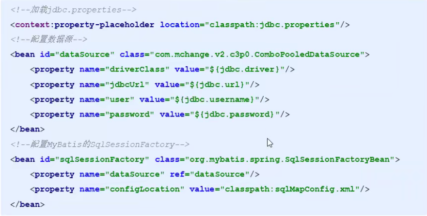 修改Mybatis的核心文件,将”加载propeties文件“和”数据源配置“操作写到到Spring配置文件中,并配置SessionFactory,最后Mybatis核心文件只剩下”定义别名“