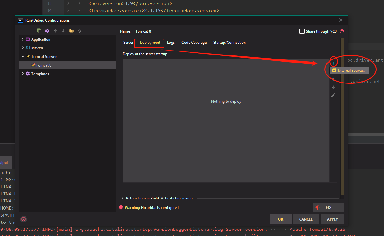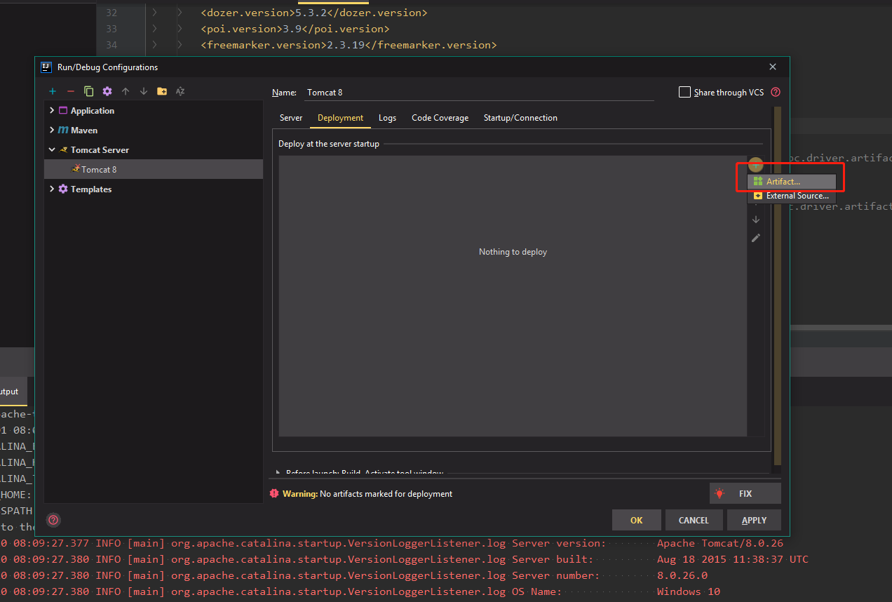 创建好之后你再回到Tomcat的配置界面,在Deployment页面占“+”号就有了“Artifacts...”的选择项了,直接选择就Artifact就基本上配置好了。