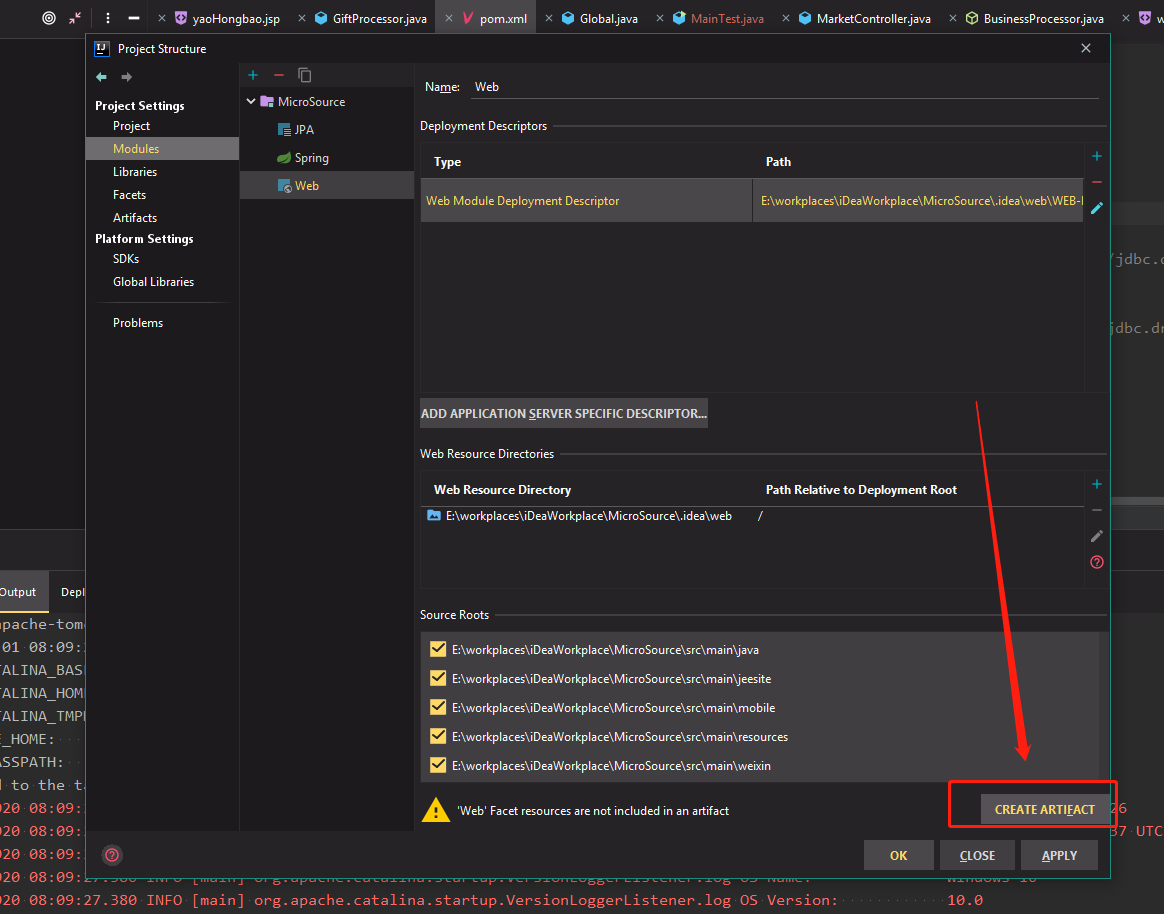 这里的Web添加成功后不用再配置其它的东西,点击 CREATE ARTIFACT ,也可以选择最左侧的 Project Setting 下的“Artifacts” 来创建 Artifacts 的配置