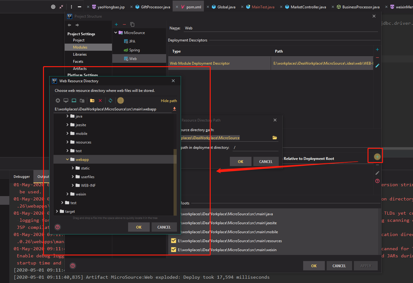 修改 “Web Resource Directeries” 为项目的 WebRoot 目录 (仅为Maven结构的,其它结构的未测试),把原来生成的那一条删除掉。