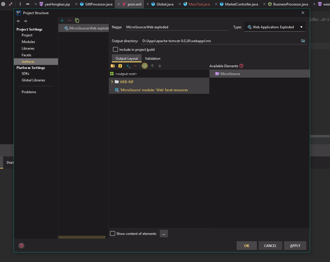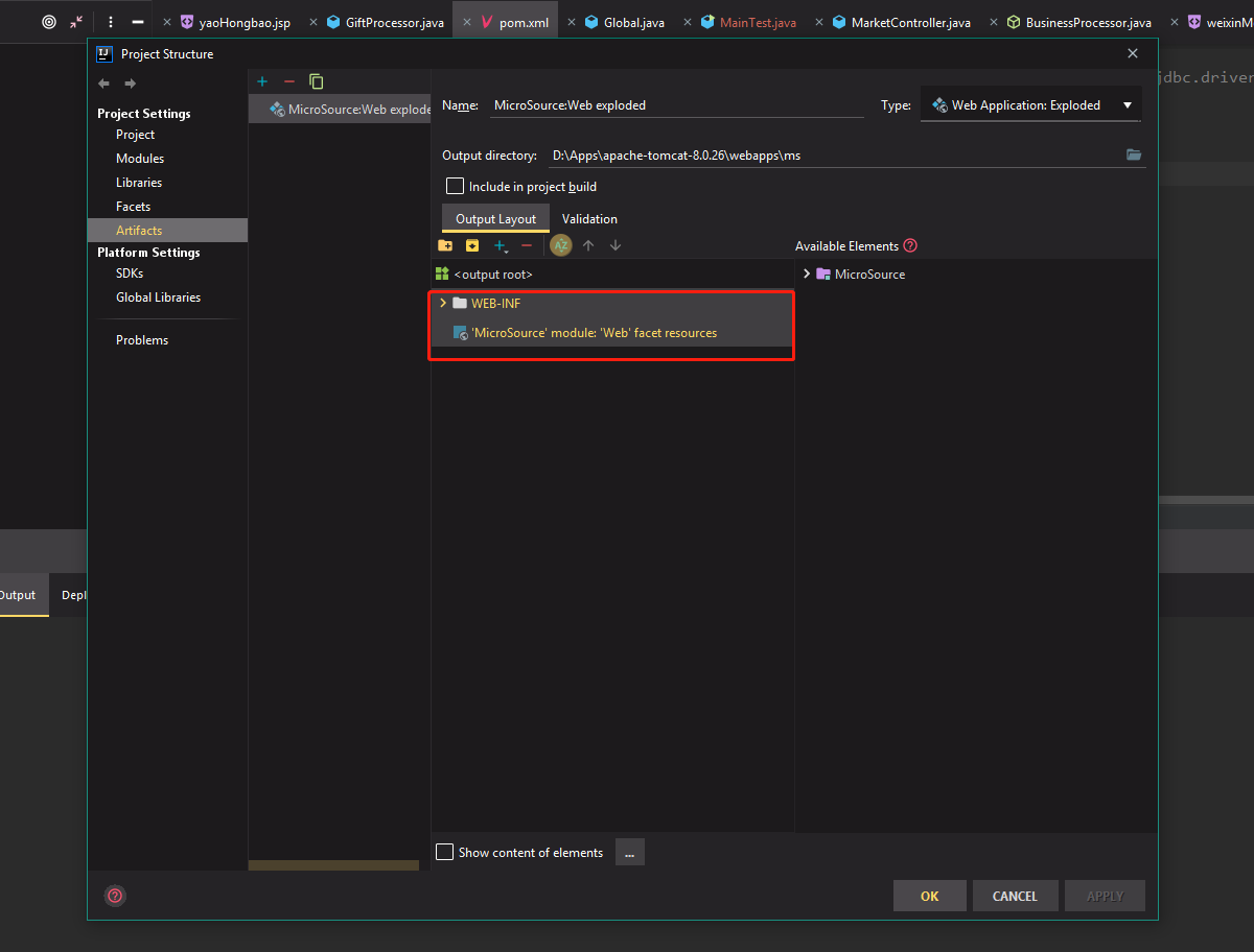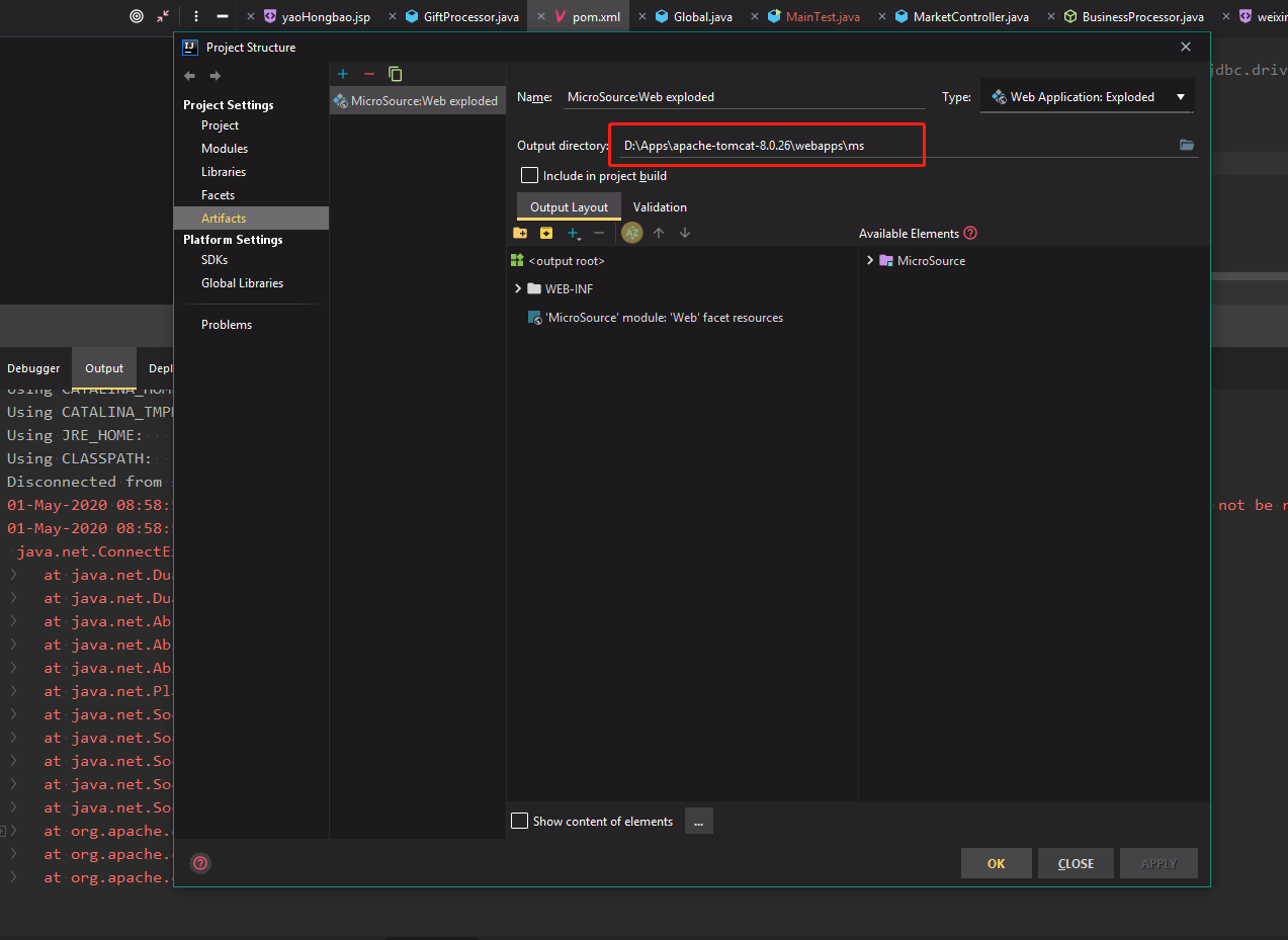 那问题出在哪里了呢?这样的一个细节问题我也是折腾了好多好多回浪费了好几个小时的时间才试错成功(让你们见笑了)。问题就是出在配置Artifacts的输出目录上。现在再回到Artifacts配置界来配置输出目录为Tomcat下的 webapps目录 :