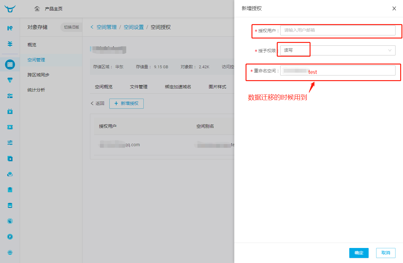1、由A —> B的数据迁移,首先登录B账户,创建一个新的bucket,开启B账户的空间授权,允许A账户可以对B账号进行可读可写权限。详细步骤:点击B账户空间权限 -》输入A账户账号 -》读写权限 -》 确定创建。随后登录A账户, 当看到A账户出现B账户开启空间权限的 bucketName 时,操作便完成。