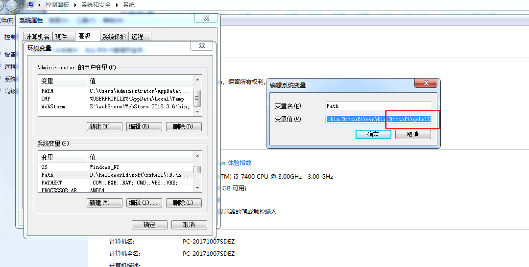 3、下载后配置windows的环境变量,笔者是将下载、解压后的qshell工具重命名为qshell.exe。并打开环境变量进行配置。配置步骤:右击“我的电脑” -》 属性 -》环境变量 -》 双击系统变量的Path -》添加相应的qshell路径即可。笔者是将qshell工具解压至D 盘下的。