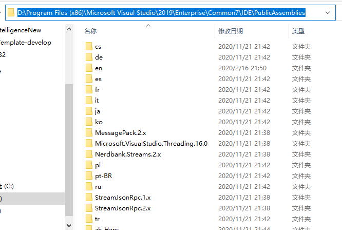 2.找到自己VisualStudio的安装路径下的PublicAssemblies文件夹,我的路径是:D:\Program Files (x86)\Microsoft Visual Studio\2019\Enterprise\Common7\IDE\PublicAssemblies