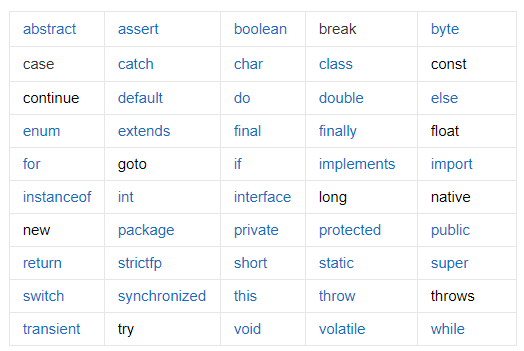 - 官方网址:https://docs.oracle.com/javase/tutorial/java/nutsandbolts/_keywords.html