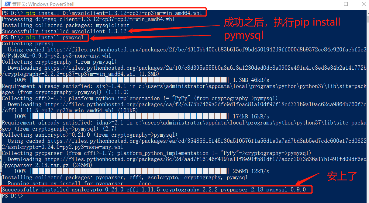 执行pip install D:\mysqlclient-1.3.12-cp37-cp37m-win_amd64.whl