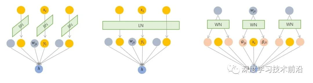 BN 和 LN 是用输入的特征数据的方差对输入数据进行 scale,而 WN 则是用 神经元的权重的欧氏范式对输入数据进行 scale。虽然在原始方法中分别进行的是特征数据规范化和参数的规范化,但本质上都实现了对数据的规范化,只是用于 scale 的参数来源不同。