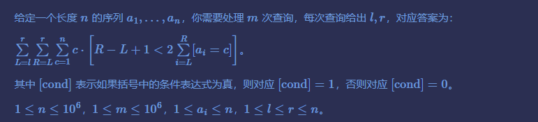 直接枚举绝对众数,序列转成 \(\pm 1\)。注意到可能被覆盖的 \(-1\) 数量 \(~cnt_1\)。从右到左(任意顺序?)把每个 \(1\) 往右的第一个未匹配 \(-1\) 和它匹配,向左同理。未被覆盖的 \(-1\) 是不可能被合法区间覆盖的,这样做到了线性。