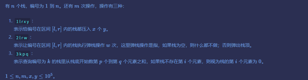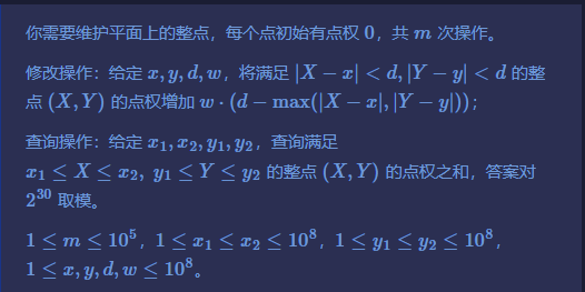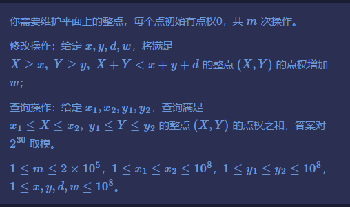 差分,每个三角形现在贴 \(y\),每个询问现在询问右上角。依靠修改位置关系(右上/半右下)分类修改,可以拆开修改贡献,类的内部是三维偏序,可以 \(O(n\log^2n)\) 解决。