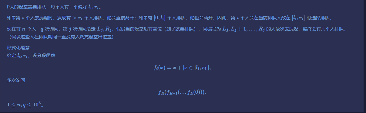 有个东西叫插入标记回收,就是说查询 \(f_l\circ f_{l+1}\circ \dots\circ f_{r}(x)\),换维扫描线扫描序列,在 \(l\) 的时候插入 \(x\),每次全局复合,在 \(r\) 时候删除这个东西或者根本不管即可。