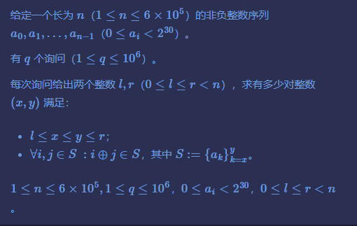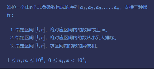 颜色段 01-trie 维护,段内可以打标记。区间打标记的话用外层搞个大线段树处理标记下传问题即可。最终复杂度还是 \(O(n\log n)\),换成压缩 01-trie 获得 \(O(n)\) 空间。